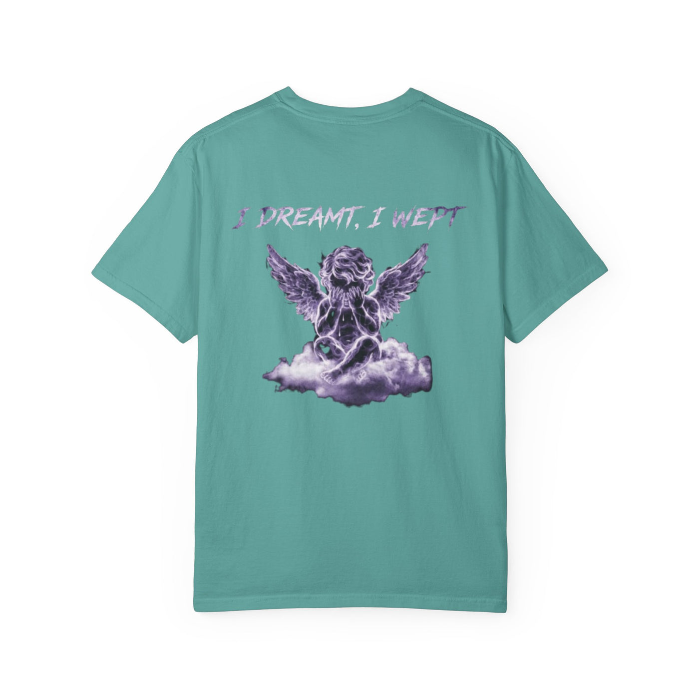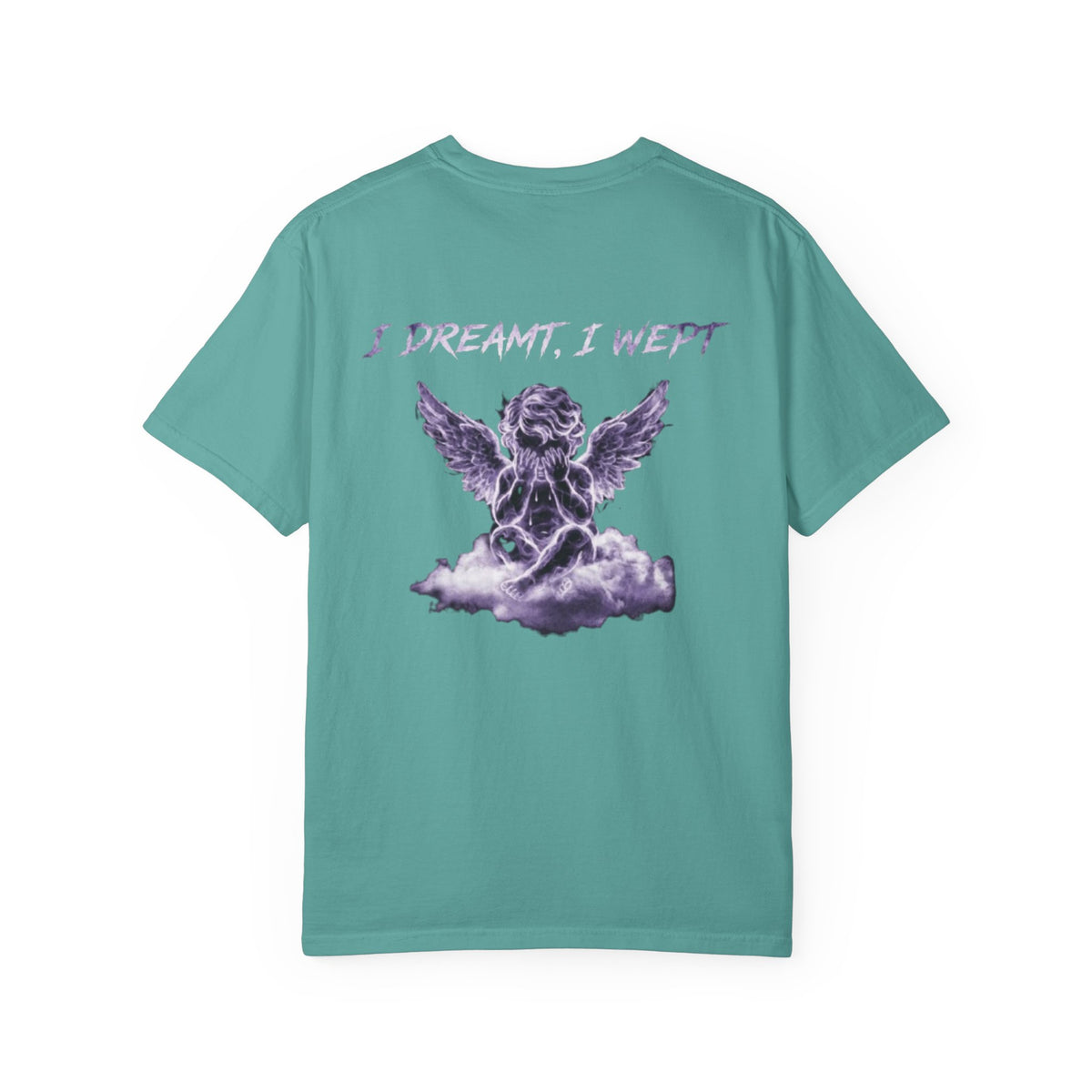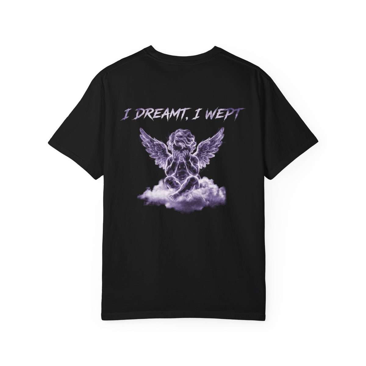 A heavyweight, garment-dyed tee with a soft, lived-in feel and a quietly nostalgic design. A small, purple-hued cherub rests on a cloud at the chest; a larger version sits on the back beneath the handwritten phrase “I DREAMT, I WENT.” The muted dye and relaxed cut give the shirt an effortless, vintage vibe — like a favorite band tee you reached for on slow, reflective nights. Wear it with worn jeans, layered under a flannel, or tossed over loungewear when you want something comfortable that still reads thoughtful and slightly otherworldly. The design’s dreamy purple tones bring a gentle contrast against darker shirt colors, lending a subtle, moody statement without shouting for attention.