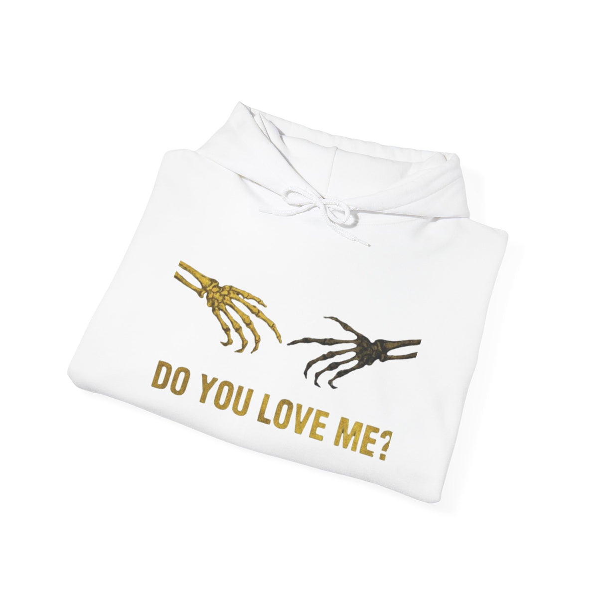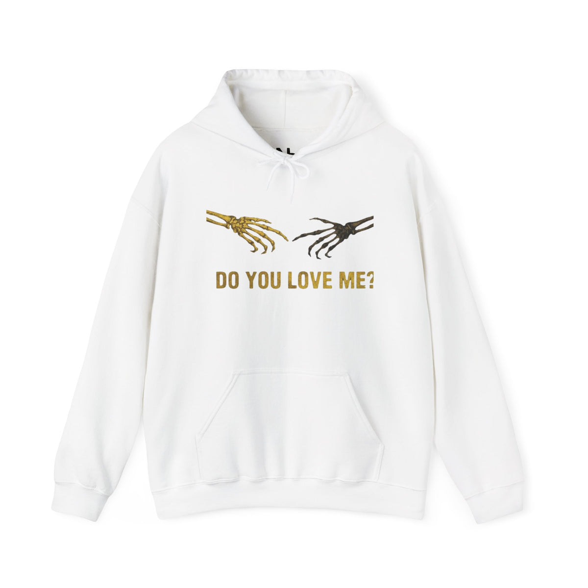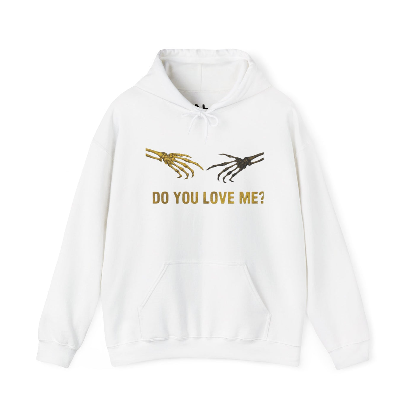 Soft, roomy warmth with a quiet, slightly eerie charm. This hooded sweatshirt pairs a clean white canvas with twin skeletal hands—one gold, one black—reaching toward each other above the phrase “DO YOU LOVE ME?” It reads like a late-night confession between friends who love dark humor and subtle goth style. Wear it layered over a tee on cool evenings, or pull the hood up and let the pouch pocket cradle your hands during long walks or museum nights. The design sits low-key: noticeable to those who recognize the vibe, but thoughtful enough to fit into everyday outfits. It feels like a small, personal story you carry with you—equal parts tender and wickedly wry.