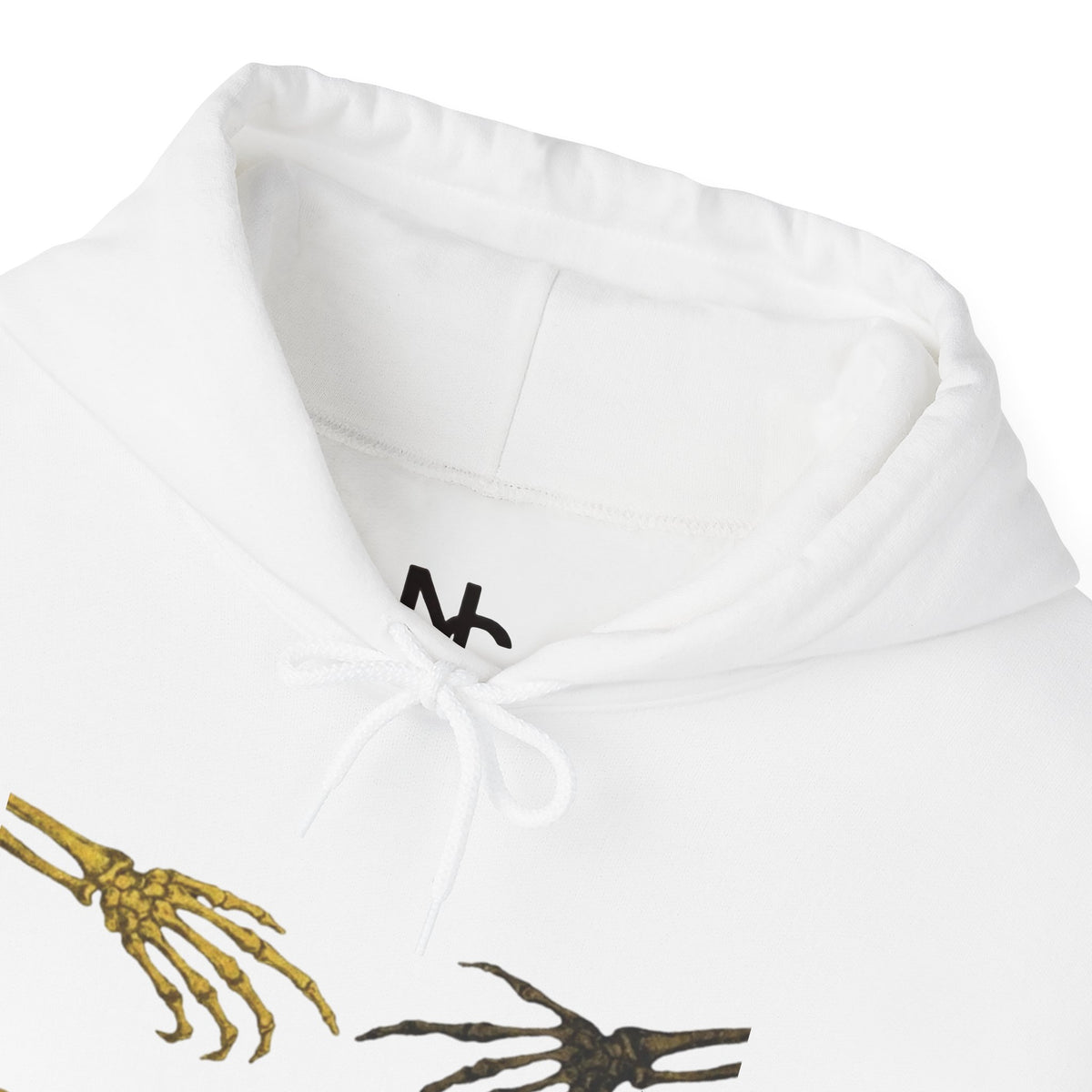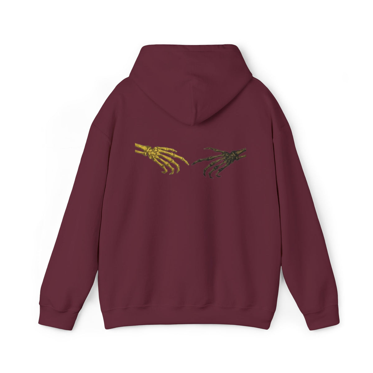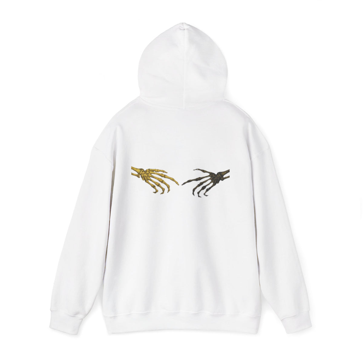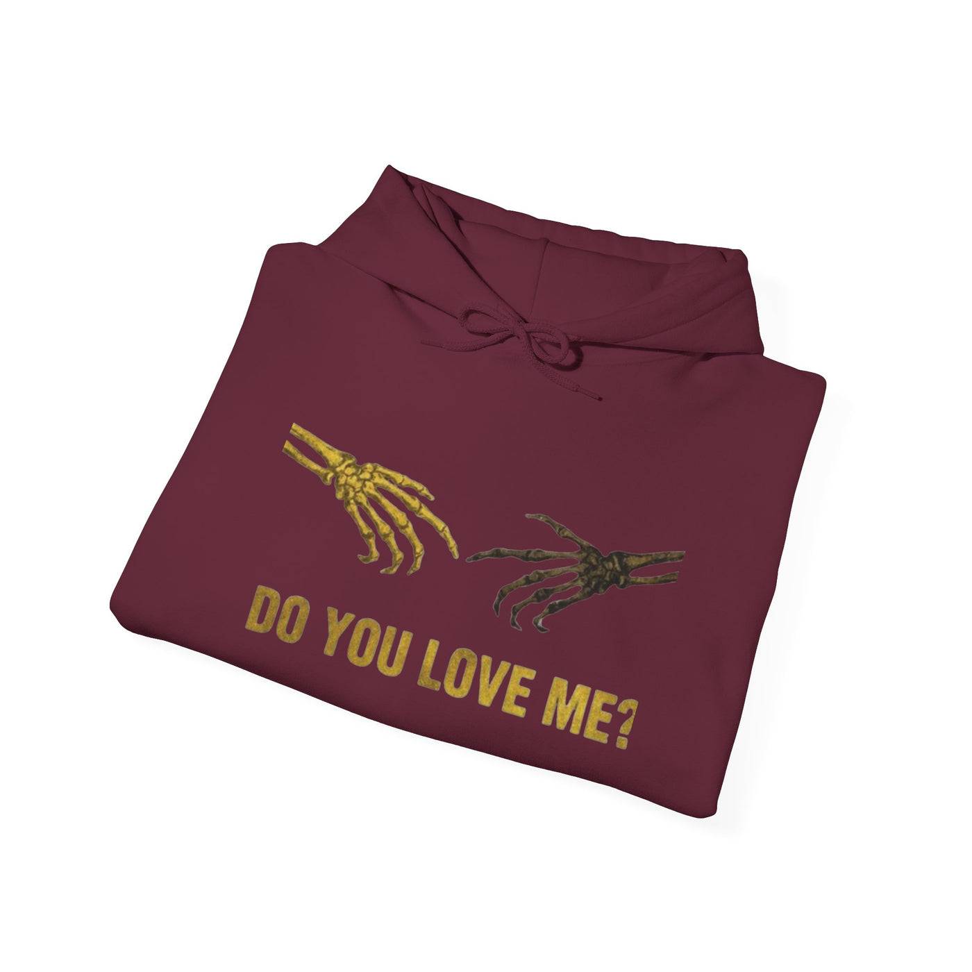 Soft, roomy warmth with a quiet, slightly eerie charm. This hooded sweatshirt pairs a clean white canvas with twin skeletal hands—one gold, one black—reaching toward each other above the phrase “DO YOU LOVE ME?” It reads like a late-night confession between friends who love dark humor and subtle goth style. Wear it layered over a tee on cool evenings, or pull the hood up and let the pouch pocket cradle your hands during long walks or museum nights. The design sits low-key: noticeable to those who recognize the vibe, but thoughtful enough to fit into everyday outfits. It feels like a small, personal story you carry with you—equal parts tender and wickedly wry.