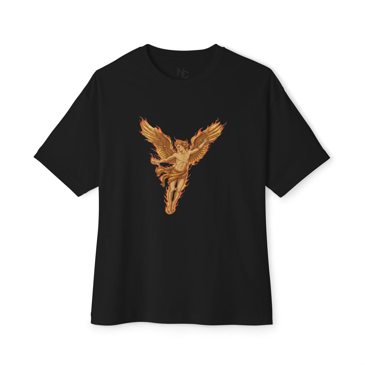This oversized boxy tee brings a bold, vintage energy to everyday wear. The central artwork — a golden, winged figure in motion — reads like a hand-painted emblem on black cotton, catching light and attention without shouting. It layers easily under jackets or stands alone as a statement piece for late-night walks, gallery visits, or coffee runs. The relaxed silhouette and dropped shoulders create an unfussy, worn-in feel that moves with you. It’s breathable and substantial enough to hold its shape, so the print stays front-and-center while the tee softens over time. Wear it when you want to feel a little heroic and quietly noticed.